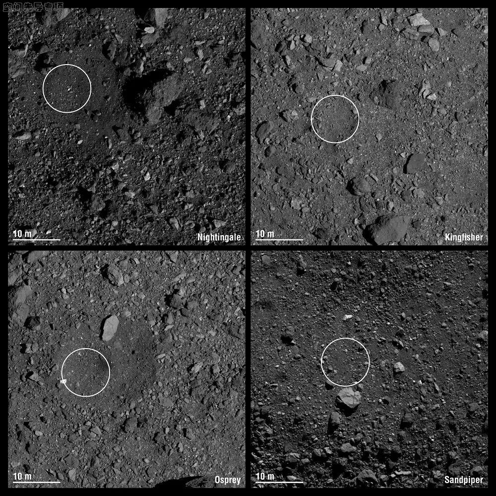 图中是美国国家航空航天局(NASA)的“奥西里斯王号小行星探测器”(OSIRIS-REx)任务在小行星本努(Bennu)上选择的四个候选样本采集点。“夜莺”(Nightingale,左上)点位于Bennu的北半球。“翠鸟”(Kingfisher,右上)点和“鹗”(Osprey,左下)点位于Bennu的赤道地区。“鹬”(Sandpiper ,右下角)点位于Bennu的南半球。这其中一个地点将在12月被选为OSIRIS-REx的着陆地点。 在几个月期间一直努力克服小行星Bennu表面崎岖的现实后,NASA第一个小行星样本返回任务的领导团队选择了四个候选地点作为“起源、光谱释义、资源识别、安全性、风化层探索者”(OSIRIS-REx)探测器“标记”其“宇宙舞伴”。 来源:NASA爱好者 国家空间科学中心 |