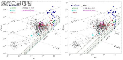 脉冲星的周期-周期导数图是脉冲星研究中最重要的观测资料图,可以将脉冲星放置其中研究不同种类的脉冲星性质。周期-周期导数图上,有一条被定义的死亡线用以区分脉冲星是否有射电辐射,在死亡线之上的脉冲星有射电辐射,而其下的脉冲星则没有射电辐射。随着观测设备的发展和进步,已被发现的射电脉冲星的数量大大增加,种类也多样化,这其中包括磁星(Magnetar)、X射线暗弱孤立中子星(XDINS)、旋转射电暂现源(RRAT)、中心致密天体(CCO)等较为典型的脉冲星类天体。但XDINSs、CCOs和部分磁星等天体虽然没有射电辐射却位于死亡线的上方。