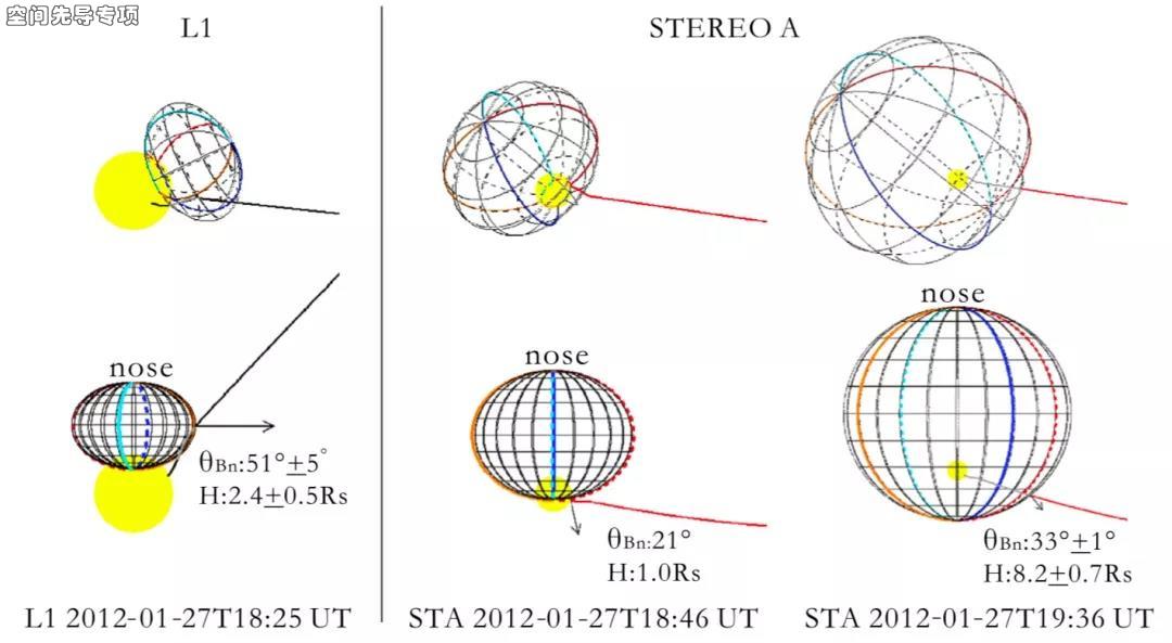 研究SEP的释放、传播以及分布特征对建立空间环境预报模型有重要的指导意义。目前SEP的释放与日冕EUV波和激波之间的相关性仍存在较大的争议。团队结合多卫星的遥感与就地观测,研究了2012年1月27日太阳爆发产生的有明显EUV波、激波和SEP的事件。该SEP事件被地球附近卫星与STEREO A观测到。 EUV波从活动区向日冕各个方向传播,传播过程中受到冕洞与其它活动区等日冕结构的影响而变得弥散。SEP开始释放时,EUV波并没有传播到观测卫星磁足点的位置。地球附近卫星观测到的高能粒子的释放时间与卫星磁力线开始链接到激波的时间一致,而STEREO A卫星观测到的高能粒子的释放时间晚于STEREO A卫星与激波初始形成磁链接的时间(见图2)。这项工作指出EUV波对高能粒子释放并不一定起重要作用,卫星与具有加速效率的激波部位的磁链接情况对高能粒子的释放有着决定性作用,这为高能粒子事件预报提供了重要的理论依据。该论文发表于The Astrophysical Journal,第一作者为朱蓓。
