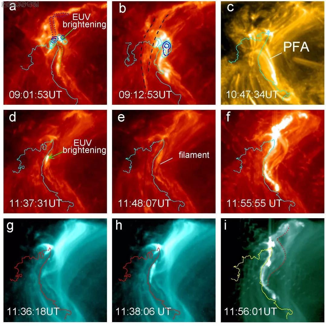 活动区12673在2017年9月6日产生两次连续的X级耀斑爆发(见图3),其中一次为过去十几年最大(X9.3)。团队研究表明,大爆发前累积浮现磁螺度达到-1.6×1043 Mx2,而累积剪切磁螺度达到-6×1043 Mx2,剪切磁螺度占到了总螺度的79%。剪切螺度在整个磁流浮现相中始终占主导地位。初始的浮现磁场包含相对较低的螺度,而更多的螺度是由于剪切和汇聚流作用在已经存在的和正在浮现的磁场上产生的。剪切运动随着磁流浮现变得越来越强,尤其是在磁场核心区的中性线两侧。垂直电流的演化显示大部分的强电流并未随磁流浮现出来,这表明大部分的浮现磁场很可能并不是强带电流的。核心区螺旋磁场(磁流绳)很可能是由于相对长时间的光球水平运动产生的。剪切和汇聚流受到磁流浮现的驱动而不断的产生。该研究揭示12673作为拥有强磁流浮现的活动区,其大部分的磁场非势性并不是由磁流浮现产生,而是来自于光球的水平运动,这对理解大的太阳爆发具有重要意义。该论文发表于The Astrophysical Journal,第一作者为王瑞。