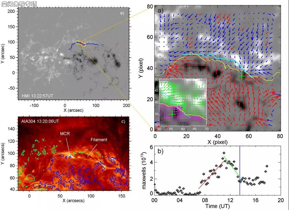 通常情况下,较大的太阳爆发被认为是来自于有着较强光球磁场分布的活动区中。然而,团队发现2015年11月4日产生的较大的太阳爆发来自于12443活动区边沿弥散磁极,并同样可以产生较强的地磁效应。该工作为太阳爆发的触发机制提供了非典型性的研究范例,对减少灾害性空间天气事件的漏报具有重要意义。通过连续的磁图我们得到流场的速度分布,并且推断出汇聚流存在于暗条下方的中性线附近(见图4)。磁场的对消现象也同时在汇聚流区域被检测出来,且最强的磁重联就发生在跟汇聚流重合的部分。这表明,汇聚运动和磁场的对消现象很可能跟弥散磁场区中性线处磁流绳结构的形成有关。暗条的中部区域处于较低的位置,贴近光球表面,且与爆发源区重合。该区域存在一个较粗的电流通道,该电流通道跟磁流绳有关。对于一个膨胀且较粗的电流通道,我们通过计算推断torus不稳定性衰减指数的关键高度应该在37-47Mm之间,该高度越低说明磁流绳越容易爆发。地球附近就地观测数据表明,该爆发产生的磁结构的南向磁场较强,引起了Dst为-90 nT的地磁暴事件。该论文发表于The Astrophysical Journal,第一作者为王瑞。