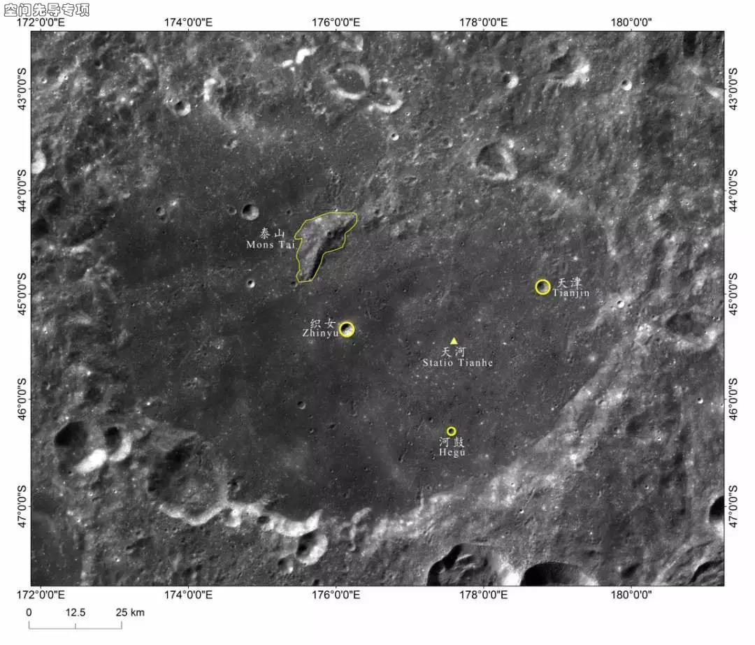 2019年2月4日,国际天文学联合会(IAU)批准了利用探月工程嫦娥二号和嫦娥四号高分辨月面影像数据申报的嫦娥四号着陆点及附近5个月球地理实体名称:嫦娥四号着陆点命名为天河基地;着陆点周围呈三角形排列的三个环形坑,分别命名为织女、河鼓和天津;着陆点所在冯·卡门坑内的中央峰命名为泰山。这是我国月球探测工程科学数据成果在月球地理实体命名上的又一次重要应用。