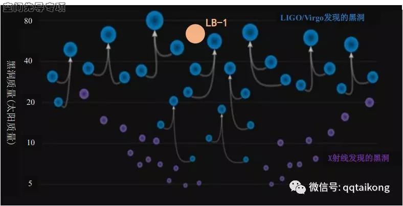 图 2 LB-1和引力波并合事件、X射线方法发现的黑洞的质量分布