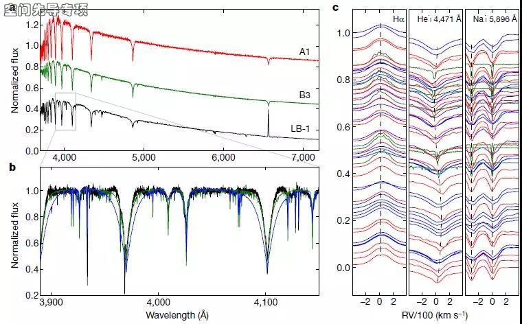 因此,这次对“霸主”LB-1黑洞的观测也是一次寻找恒星级黑洞方法上的创新。LB-1黑洞所在的双星系统是没有足够强的X射线辐射的,事实上这颗黑洞和它的伴星相距较远(1.5倍日地距离),研究人员用美国钱德拉X射线天文台的观测表明LB-1黑洞对其伴星吸积非常微弱。但是,科学家们观测和比对双星系统中伴星的光谱,发现光谱中一条近乎静止且运行方向和B型星反相位的明线(Hα发射线),并在深入的计算中推算出该双星系统中存在一个质量约为70倍太阳质量的不可见天体,质量又大又不可见,从各种性质来看,它都只能是黑洞。
