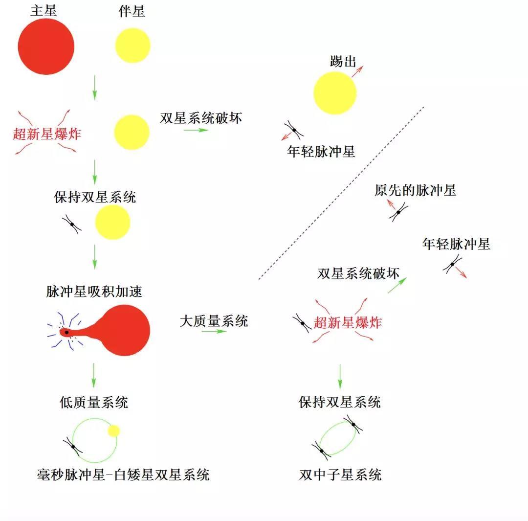 目前公认的毫秒脉冲星诞生及演化理论认为,毫秒脉冲星形成于一个类似于跳“华尔兹”的过程:即处于双星系统中的两颗星星,长得胖的(即:主星)会先经历超新星爆发,抛出自身一部分物质,此时如果它的“舞伴”(即:伴星)比较瘦弱就会被快速地踢出,同时双星系统瓦解,而主星爆炸后留下部分会塌缩形成快速旋转的中子星;如果伴星的“体重”足以抵御超新星爆发产生的冲击,就会留在之前的双星系统中,与新形成的中子星继续这段“华尔兹”直到生命的尽头。