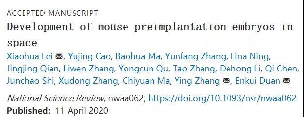 超越地球行星的生命发展是人类的长期追求,但尚不清楚哺乳动物能否在太空中进行正常的胚胎发育。 2020年4月11日,中国科学院动物研究所段恩奎,张莹及Lei Xiaohua共同通讯在National Science Review 在线发表题为“Development of mouse preimplantation embryos in space”的研究论文,该研究发现植入前的小鼠胚胎可以在太空中发育,但是胚泡形成的速度和胚泡质量受到了损害。 此外,胚胎中的细胞含有严重的DNA损伤,而在太空中发育的胚泡的基因组则通过一组独特的差异甲基化区域(DMR)整体被低甲基化。发育缺陷,DNA损伤和表观遗传异常可以通过地面低剂量辐射的作用大大地模仿。但是,仅暴露于模拟微重力下并不会导致胚胎发育的重大中断,这表明辐射是造成发育缺陷的主要原因。这项工作提高了对空间胚胎发育的理解,并揭示了长期极低剂量辐射是哺乳动物繁殖的危险因素。