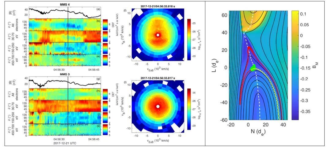 图1.MMS不同卫星在重联出流区观测到的有显著差异的电子分布(左)和电子双向束流在粒子模拟中的起因(右)。