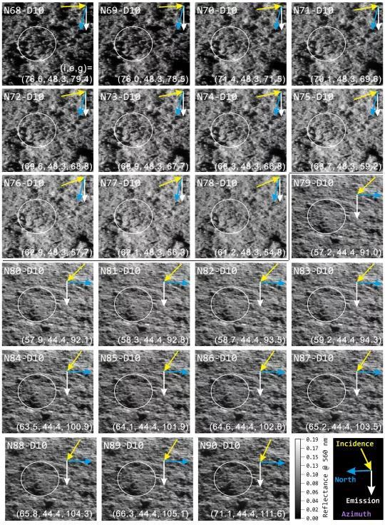 近期,中科院国家空间科学中心空间天气学国家重点实验室刘洋研究员与中科院地质与地球物理所林杨挺研究员团队合作,利用玉兔2号可见光近红外光谱,对所测光谱如何受到观测几何角度的影响进行了详细研究。玉兔2号在月面工作的第十个月昼,对月表的同一个区域进行了连续的光谱探测。在测量过程中,月球车保持不动,而太阳位置的不断变化改变了观测的几何角度,这就给科学家提供了一个研究观测几何角度对月表物质光谱影响的绝佳机会。研究结果发现,观测几何角度的变化会对矿物成分的解译带来较大偏差,在1000 nm处的光谱吸收位置最大变化约有30 nm,2000 nm处的最大变化约为150 nm。因此,对光谱进行光度校正(所有光谱校正到同一角度)对光谱解译来说是非常重要的过程。这一组原位测量的光度数据也可作为后续数据光度校正的基础。