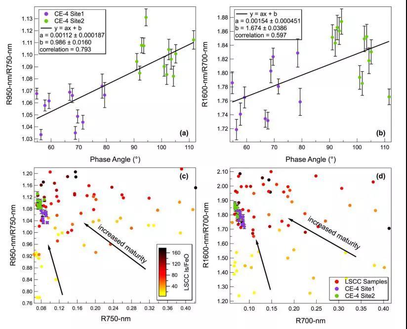 月表的主要矿物橄榄石、辉石和斜长石等在可见-近红外波段具有特定的光谱吸收特征,这些光谱特征会受到观测几何角度的影响,产生光谱形态和吸收特征的变化,直接影响根据月壤光谱判断月表矿物类型的准确性。另外,随着月壤暴露时间的增加,月表物质的“风化”程度会逐渐增加,其光谱的整体反射率会降低、光谱斜率会变大、吸收峰深度也会变弱,因此,科学家常常将光谱斜率与反照率特征相联合,来表征月表的成熟度,但观测角度变化所产生的光谱斜率及反照率的变化也可能对月表风化程度的解译造成干扰。