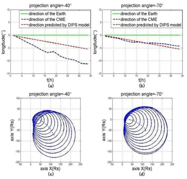 共转相互作用区(CIR)是太阳风中的一种重要结构,当快速CME传播在行星际空间中,与CIR发生相互作用时,也会改变原有的传播路径。因此,对CIR影响下的CME偏转过程进行数值模拟研究具有重要意义。沈芳团队博士生刘佑生等基于GCS模型,构建了一种新的三维CME磁绳模型(图2),模拟了快速CME在行星际空间的传播及偏转过程。结果表明,当快速CME在行星际空间传播时,其传播方向会向东偏转;当其与西侧的CIR发生相互作用时,由于受到CIR的阻碍,其偏转情况跟前者相比会有所加剧(图2)。图2(a)和(c)表示有CIR作用情况下快速CME的偏转,图2(b)和(d)表示没有CIR作用情况下快速CME的偏转。相关研究成果以Numerical Simulation on the Propagation and Deflection of Fast Coronal Mass Ejections (CMEs) Interacting with a Corotating Interaction Region in Interplanetary Space为题,发表在The Astrophysical Journal上。