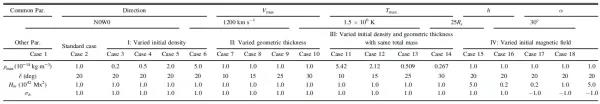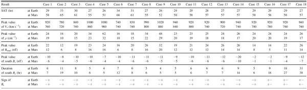 此外,研究人员还针对新的CME磁绳模型的初始几何参数和物理设定对不同位置处行星际空间模拟结果的影响开展了参数研究,主要讨论了CME初始参数,包括密度、几何大小、质量、磁场对地球和火星位置处数值模拟结果的影响。在数值模拟中,研究人员采用了IN-TVD-MHD数值模式、六片网格技术及GCS-based CME flux rope模型。该模拟工作主要针对初始CME传播方向沿日地连线的情况而展开,选取卡林顿周2093时位于地球和火星两个位置的结果作为研究对象,针对包括CME模型初始的密度、磁绳初始几何尺寸、总质量以及初始磁场大小和方向在内的初始参数,进行了总计18组CME事件的研究(表1),对地球和火星位置处的激波到达时间、各参数峰值及南向磁场持续时间等模拟结果进行了定量对比分析(表2)。