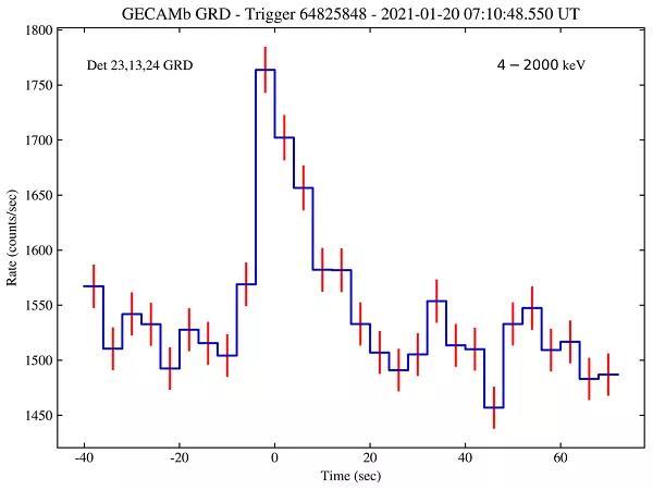 2021年7月1日,国家空间科学数据中心(以下简称“本中心”)公开发布引力波暴高能电磁对应体全天监测器卫星(GECAM)的第一批科学观测数据,由中国科学院国家空间科学中心制作提供,可应用于中子星、黑洞等致密天体及其并合过程、各类特殊暴发现象的物理起源、辐射机制及爆发机制等方面的研究。 1) GECAM卫星(A星)事后精轨根数产品