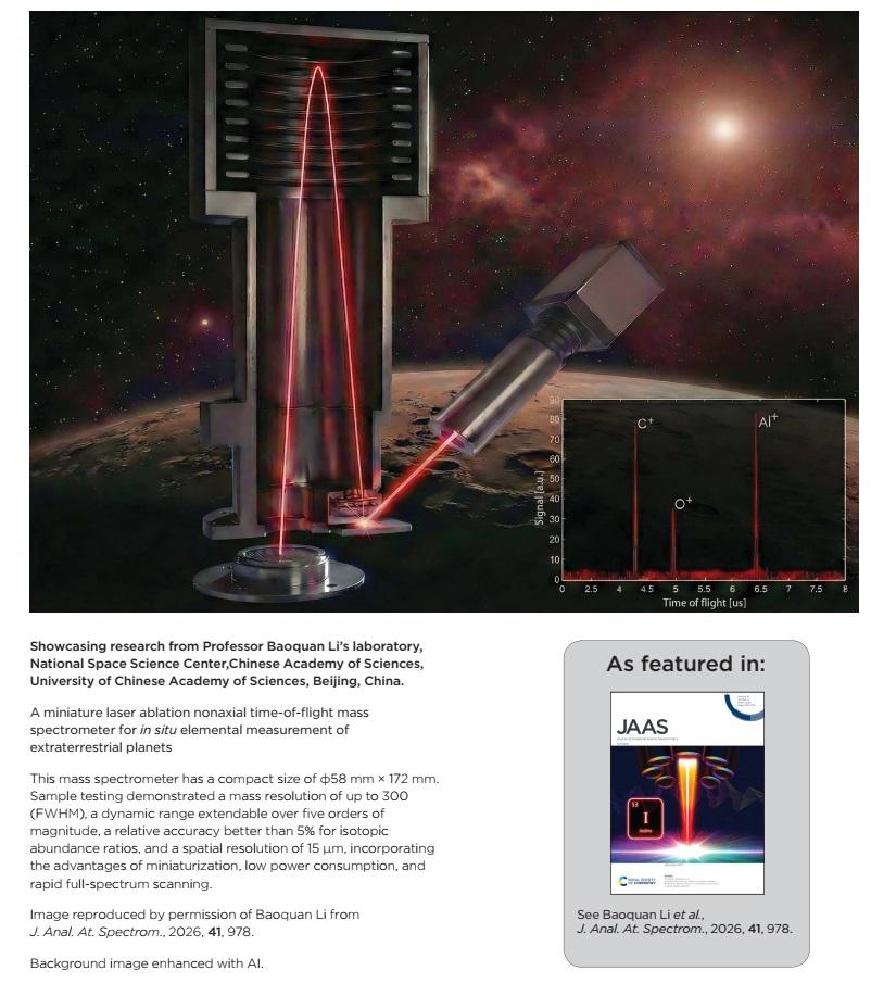 近日,中国科学院国家空间科学中心的李保权团队在质谱领域期刊Journal of Analytical Atomic Spectrometry发表了最新研究成果“A miniature laser ablation nonaxial time-of-flight mass spectrometer for in situ elemental measurement of extraterrestrial planets”,团队成功研发出一款基于激光烧蚀的飞行时间质谱仪,该仪器具有小型化、低功耗与高质量分辨的特点,为行星物质成分及同位素探测提供了新的技术手段。该成果以封面论文的形式发表在2026年的JAAS上(JAAS,2026,41,978–988,DOI:10.1039/d5ja00433k)。