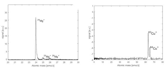 实验测试结果显示,该质谱仪性能表现优异,对铝合金样品测试单谱质量分辨率416,多谱叠加分辨率300,动态范围拓展至五个数量级,同位素丰度比的相对测量精度优于5%,空间分辨率达15 μm。借助脉冲激光优势,每秒可完成多达1000次单光谱测量,且无需复杂的样品前处理,可实现固体样品的直接分析。此外,在镁、铜等纯金属样品测试中,仪器能清晰分辨不同同位素的质量谱图,测得的同位素丰度比与天然丰度高度吻合,验证了其在同位素定量分析中的可靠性。