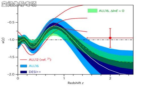 利用最新观测数据得到的暗能量状态方程演化历史(淡蓝色阴影)。如图所示,状态方程偏离-1,并围绕-1振荡。此行为与quintom暗能量模型的预言一致。
