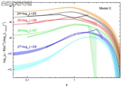 近日,中国科学院云南天文台袁尊理、王建成等结合更全面的观测数据,充分考虑样本谱指数分布的影响,利用贝叶斯方法计算了活动星系核(AGN)的射电光度函数,发现射电噪AGN的演化遵从由密度演化和光度演化共同主导的混合演化模式,并给出了无量纲化的密度演化和光度演化(图1)。 密度演化反映了AGN的数目随红移的变化,而光度演化则描述了AGN的特征光度随红移的变化,二者反映物理上截然不同的两种演化机制,但传统的射电光度函数模型难以区分密度演化和光度演化对AGN总体演化的具体贡献,即存在所谓的演化简并,而袁尊理等提出的混合演化模型能自然而然地解除演化简并。 已有的研究发现射电噪AGN表现出光度依赖的演化特性,即低光度源的演化在红移为1左右趋于平缓甚至停止演化,而高光度源的强演化一直持续到红移为3左右。鉴于此观测现象,传统理论认为低光度和高光度的射电噪AGN具有不同的宇宙学演化。科研人员提出低光度和高光度的射电噪AGN遵从同样的混合演化模式,其中低光度源对密度演化更敏感,而高光度源对光度演化更敏感,才造成“光度依赖的演化”的表象。混合演化模型不仅符合观测到的射电光度函数(图2),而且能精确地预言多波段射电计数(图3)。 研究结果发表在The Astrophysical Journal上。