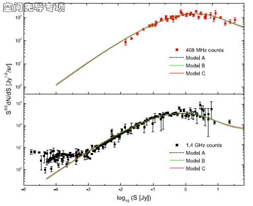 图3.观测到的多波段射电计数与混合演化模型对比(取自原文)