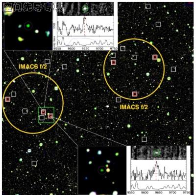 研究人员使用卡内基天文台麦哲伦望远镜证认获得了6个宇宙早期红移约7.0的星系(红色方框) 来源:中国科学技术大学 |