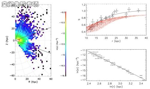 左侧是恒星晕的空间分布密度切面图。右上显示恒星晕的椭球短轴-长轴之比(q)如何随着银心距离(r)而变化;右下图则显示沿着径向晕族恒星的数密度符合单一幂律(在图中即为沿直线下降)。 来源:国家天文台 |
