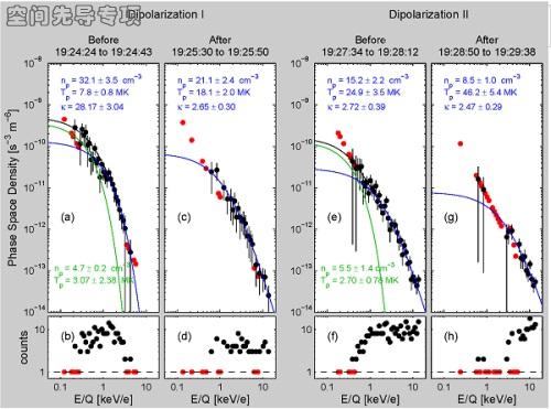 图1.水星两次偶极化之前(a,e)和之后(c,g)的质子相空间密度和counts(b,d,f,h)分布。图中黑点为仪器counts数大于1的测量点,红点为仪器counts数等于1的测量点。蓝线为高能部分Kappa分布的拟合,绿线为低能部分高斯拟合,黑线为两者之和。