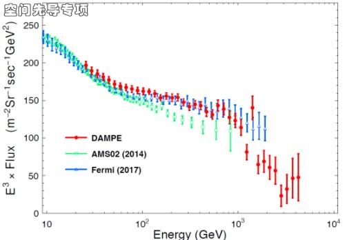 “悟空”工作530天得到的高精度宇宙射线电子能谱(红色数据点),以及和美国费米卫星测量结果(蓝点)、丁肇中院士领导的阿尔法磁谱仪的测量结果(绿点)的比较。