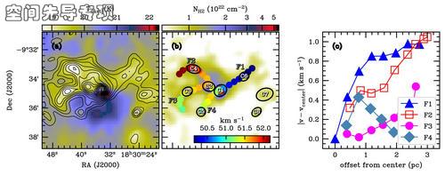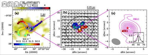 (a)纤维状结构上的速度分布(彩色实心圆点)。背景为柱密度分布。(b)致密团块C1的13CO (3-2) 谱线轮廓分布。红色和蓝色背景为SMA观测揭示的外向流。(c)SMA观测揭示的小尺度云核。中心五角心标识了正在增长质量的大质量原恒星。右下角插图中展示了最中心的13CO (2-1) 谱线。