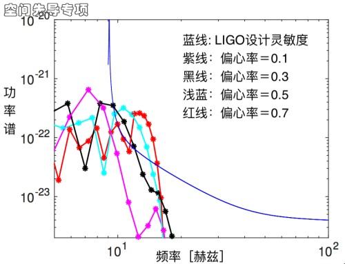 图中某一颜色的引力波信号曲线和蓝色的LIGO灵敏度曲线所围成的面积代表信噪比,可以看出轨道的偏心率越大,即轨道越椭,引力波的信噪比越高