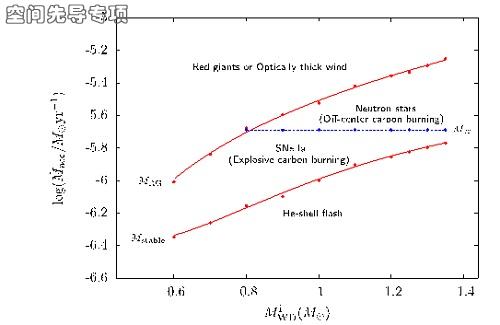 图2.白矮星初始质量vs.吸积率。当吸积率足够高时,白矮星将形成红巨星或触发光学厚星风;当吸积率变低时,触发新星爆发;碳氧白矮星只能在一个很窄的吸积率范围内稳定吸积物质;蓝色虚线为临界吸积率(图片来源: Wang, Podsiadlowski & Han 2017, MNRAS, 472, 1593)