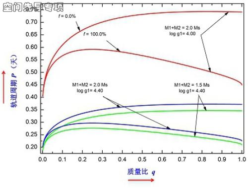 图1.相接双星动力学参数图。实线组表示质量比q、轨道周期周期P、相接度f、总质量M以及子星1表面引力加速度之间的关系。同颜色的实线为一组。它代表M和引力加速度一定的情况下,相接度从0%至100%的参数取值范围。