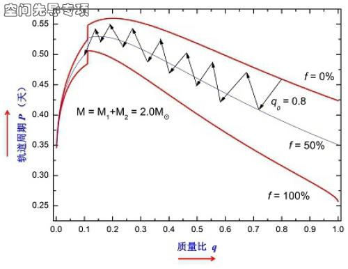 图2.相接双星动力学演化图。实线表示与图一相同。该图中子星1的引力加速度满足主序星的相应关系。总质量2.0太阳质量的相接双星系统可能沿着图中所示的黑色箭头线演化。这种公共包层振荡性演化引起的轨道周期变化符合目前的观测结果。图中红蓝实线的跳变来自主序星质量-半径关系不连续