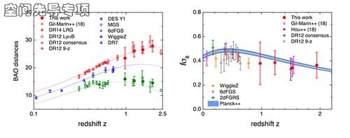 eBOSS合作组通过观测类星体获得的宇宙膨胀(左图)以及结构形成历史重建结果(右图)。图中含误差棒的红色实心圆圈为本次发布的结果,其余测量来自其他星系巡天观测结果;图中曲线是利用Planck卫星观测宇宙早期微波背景辐射,并假设标准宇宙学模型得到的拟合结果。(图片来源:Zhao et al.,2018)