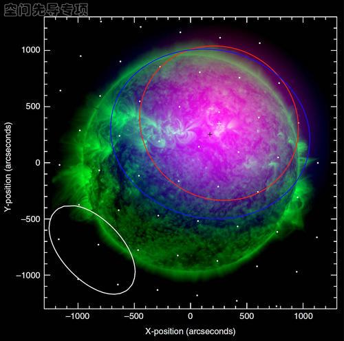 32.5MHz射电III型爆发源成像(红:基频辐射;蓝:谐频辐射)和极紫外成像(绿色)