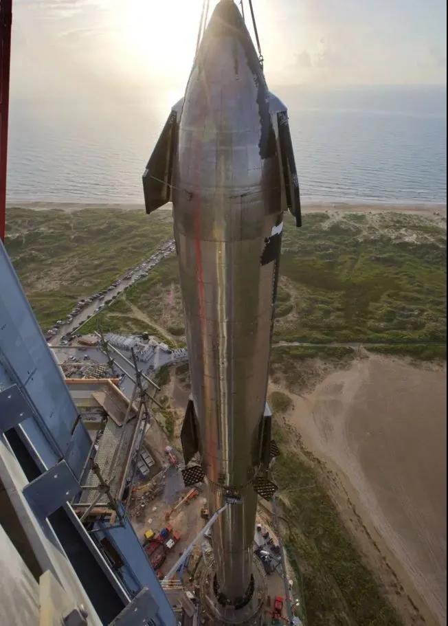 箭指载人登陆火星 “星船”矗立在发射台架上,火箭总高度更是达到了145米,确实让人感到非常震撼。