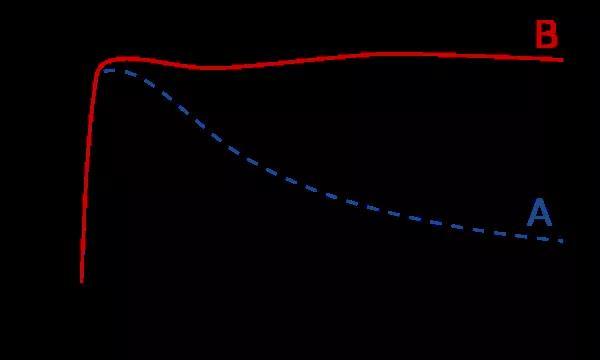 传统理论预测的(A)与观测到的(B)典型旋涡星系自转曲线对比,横轴为距离星系中心的距离 / Wikipedia