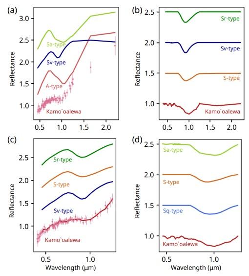 由于观测条件的限制,目前人们对近地小行星2016HO3的表面物质组成和太空风化特性仍缺乏充分认识。唯一已公开发表的光谱数据来自Sharkey et al. (2021)使用LBT望远镜的观测结果。该光谱显示出两个明显的特征:一是存在明显的1μm吸收峰;二是光谱斜率非常高,光谱曲线比大多数S-型小行星都更陡。该光谱数据由两部分拼接而成:光谱仪测得的可见-近红外(VNIR)光谱,覆盖波段至约1.25μm;其他波段则只有z、J、H、K四个宽谱段的测光数据。