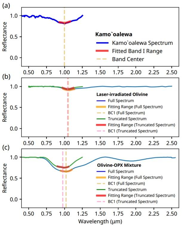 对2016HO3光谱1μm吸收峰中心波长的分析,进一步支持了其可能具有较高橄榄石含量的推测。本研究对2016HO3的VNIR光谱去连续统后,利用多项式函数对吸收峰部分进行了拟合以确定1μm吸收峰的中心波长(BC1),其吸收中心位于1.00μm。同时,本研究还发现,若仅使用1.25μm之前的光谱来提取BC1,结果会系统性地偏向更短的波长(图2)。这是因为1.25μm之前的光谱不能完全覆盖1μm吸收峰的右半部分,从而影响光谱连续统计算。具体而言,1μm吸收峰右半部分的缺失会使连续统相对于全波段连续统偏低,且长波端偏低程度更大,进而导致去连续统光谱右半部分反射率偏高,最终使吸收中心向短波偏移。因此,2016HO3 实际上的BC1应大于或等于1.00μm,符合橄榄石含量较高的光谱特征。