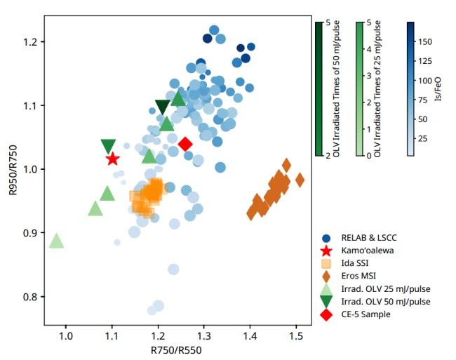 本研究还提出了一种适用于归一化光谱的太空风化程度评估模型。该模型基于现有的光学成熟度(OMAT)指标发展而来。通过将具有不同风化成熟度的月球样品数据投射到以R750/R550(750nm与550nm反射率比值)为横坐标、R950/R750为纵坐标的散点图中,本研究发现从左下角到右上角,用于表征风化成熟度的Is/FeO值呈逐渐上升趋势(图3)。对于归一化光谱,其归一化因子在分子和分母中同时出现并相互抵消,因此该模型规律同样适用于归一化反射率光谱和绝对反射率光谱。此外,由于归一化光谱在很大程度上消除了观测条件引起的亮度差异,该模型有潜力适用于更多光谱观测数据。
