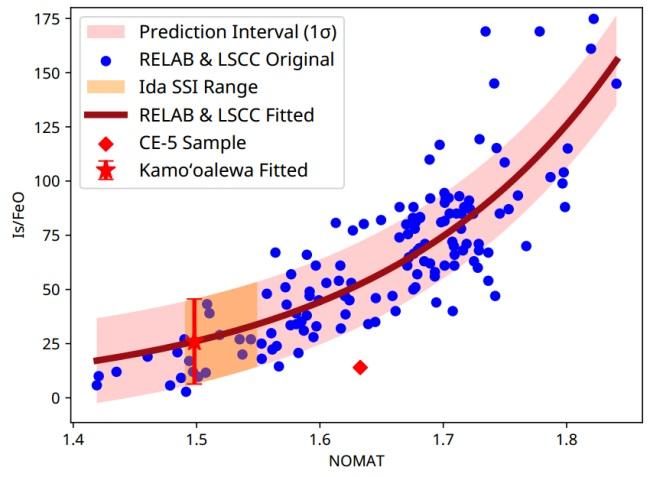 进一步分析显示,图3中月球样品数据点与坐标原点的直线距离,与其对应的Is/FeO值具有较好的相关性。我们将该距离定义为NOMAT(Normalized Optical Maturity,归一化光学成熟度)。通过拟合两者关系得到经验公式(图4),进而推算出2016HO3的Is/FeO值为25.97 ± 19.62。在月球样品成熟度框架下(Is/FeO值0-30为不成熟,30-60为亚成熟,60-100为成熟),这对应不成熟至亚成熟的范围。