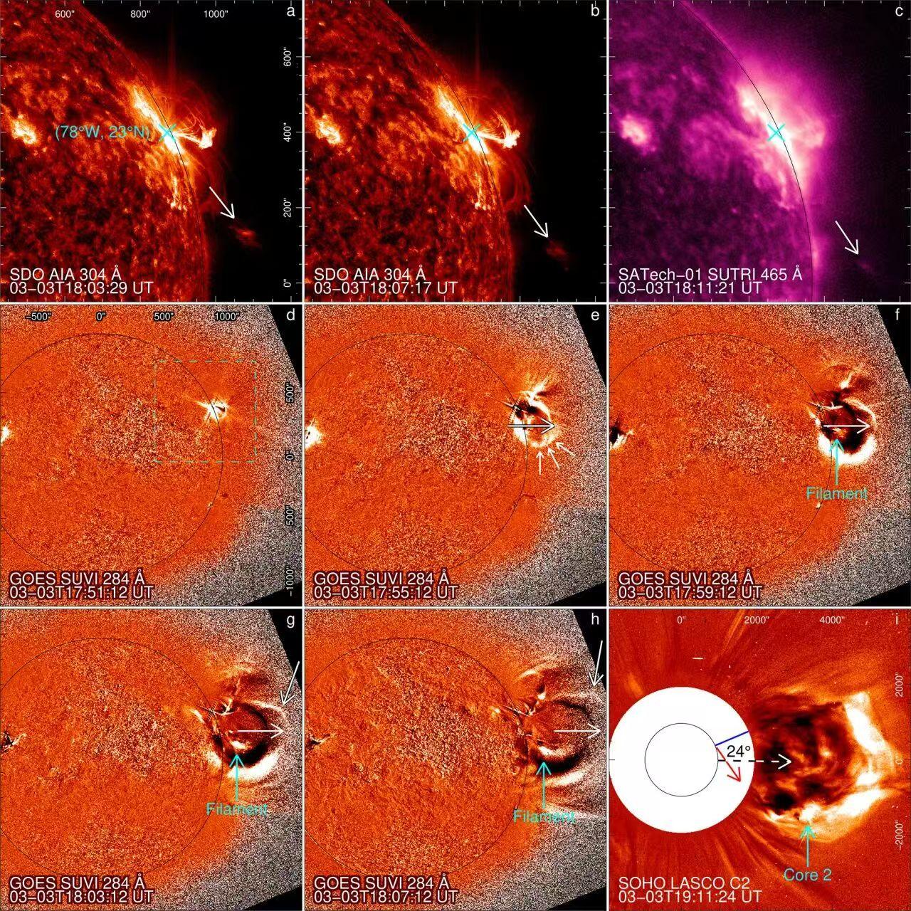 图1. 多波段观测的2023年3月3日CME从非径向转为径向传播的过程。(a)-(c) 太阳动力学天文台/大气成像仪(SDO/AIA)304 Å和我国自主太阳上过渡区成像仪(SUTRI)465 Å观测到的沿着非径向运动的暗条;(d)-(h) GOES卫星太阳极紫外成像仪(SUVI)284 Å观测到CME通过侧向形变从非径向传播转为径向传播;(i) 太阳和日球观测台(SOHO)/LASCO C2日冕仪观测到CME最终沿径向传播。