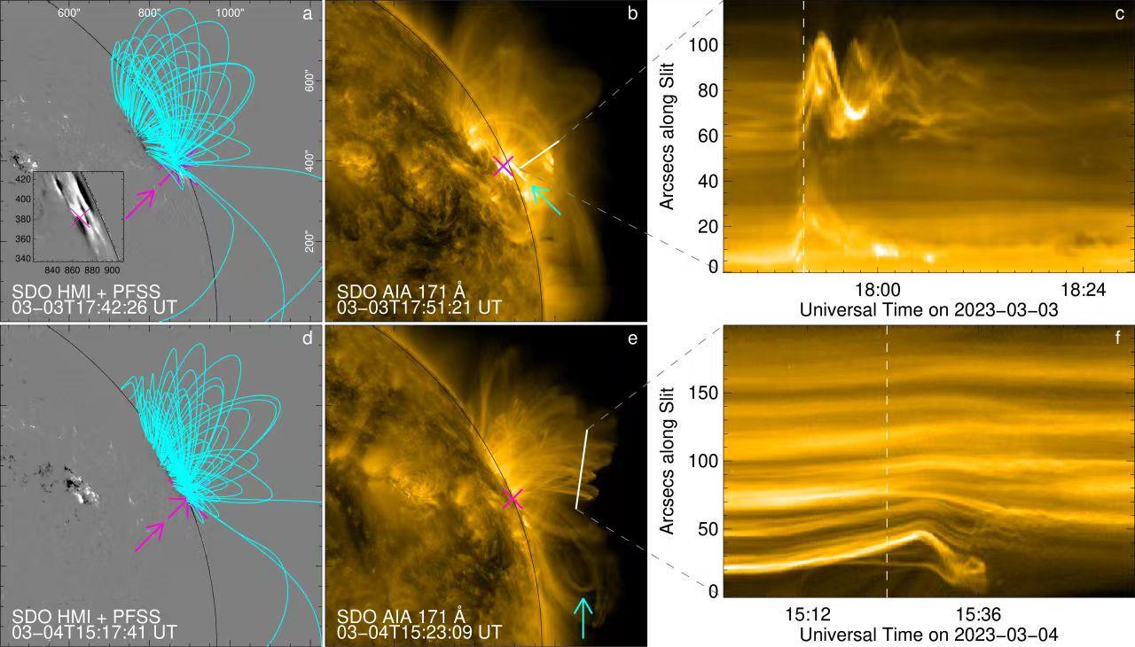 图2. (a)+(d) CME源区上方的磁环系统(蓝绿色曲线)。(b)+(e) SDO/AIA 171 Å观测到两个CME在早期沿非径向传播的形态。(c)+(f) 显示CME与磁环相互作用引发磁环振荡的时间-距离图。